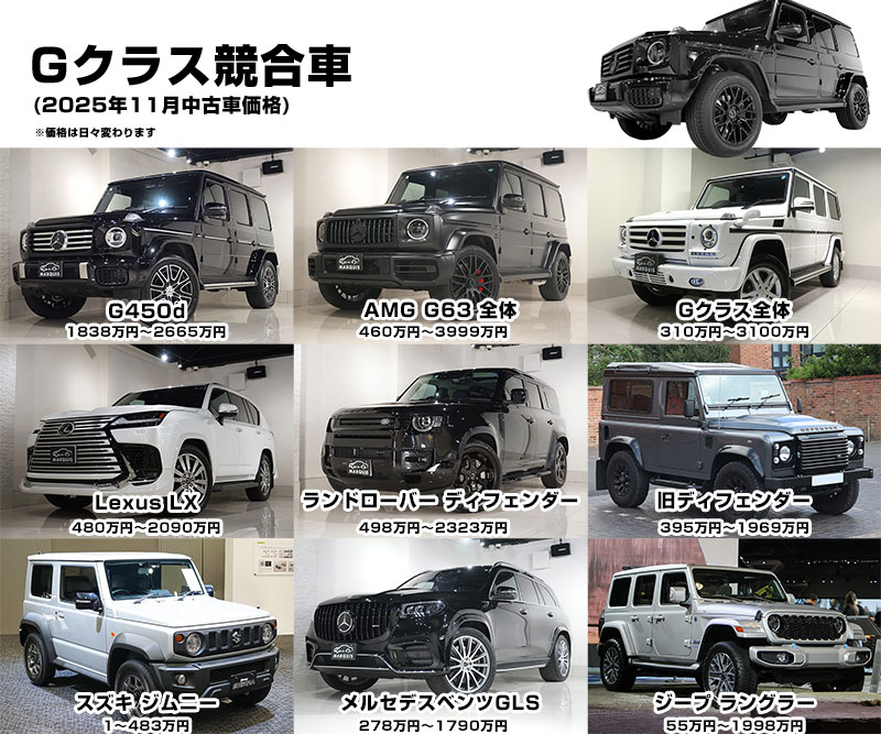 現行のG450dやG63、限定モデルもタイミングによりお取り扱いもあり。